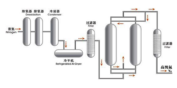氮?dú)饧兓b置是以變壓吸附制得的粗氮為原料,經(jīng)加氫催化除氧,冷凝水吸附兩級(jí)干燥除塵,去除氮?dú)庵械难?、水汽和塵埃等雜質(zhì),從而獲得高純度的氮?dú)狻F淙丝诘拇值兌纫?ge;98%,出口精氮的純度≥99.999%,氧含量≤3μm,露點(diǎn)≤-65℃。